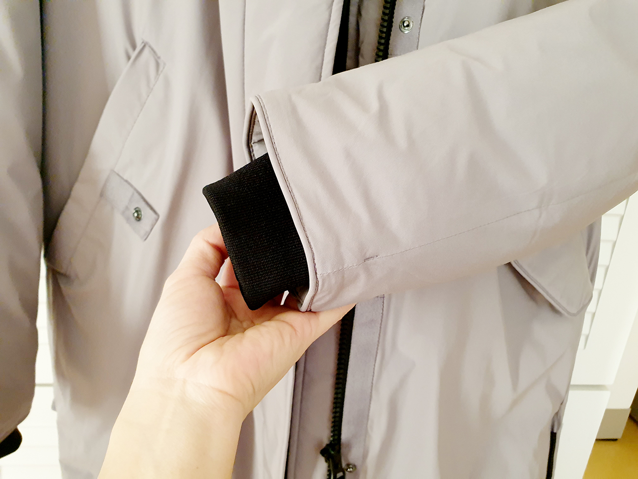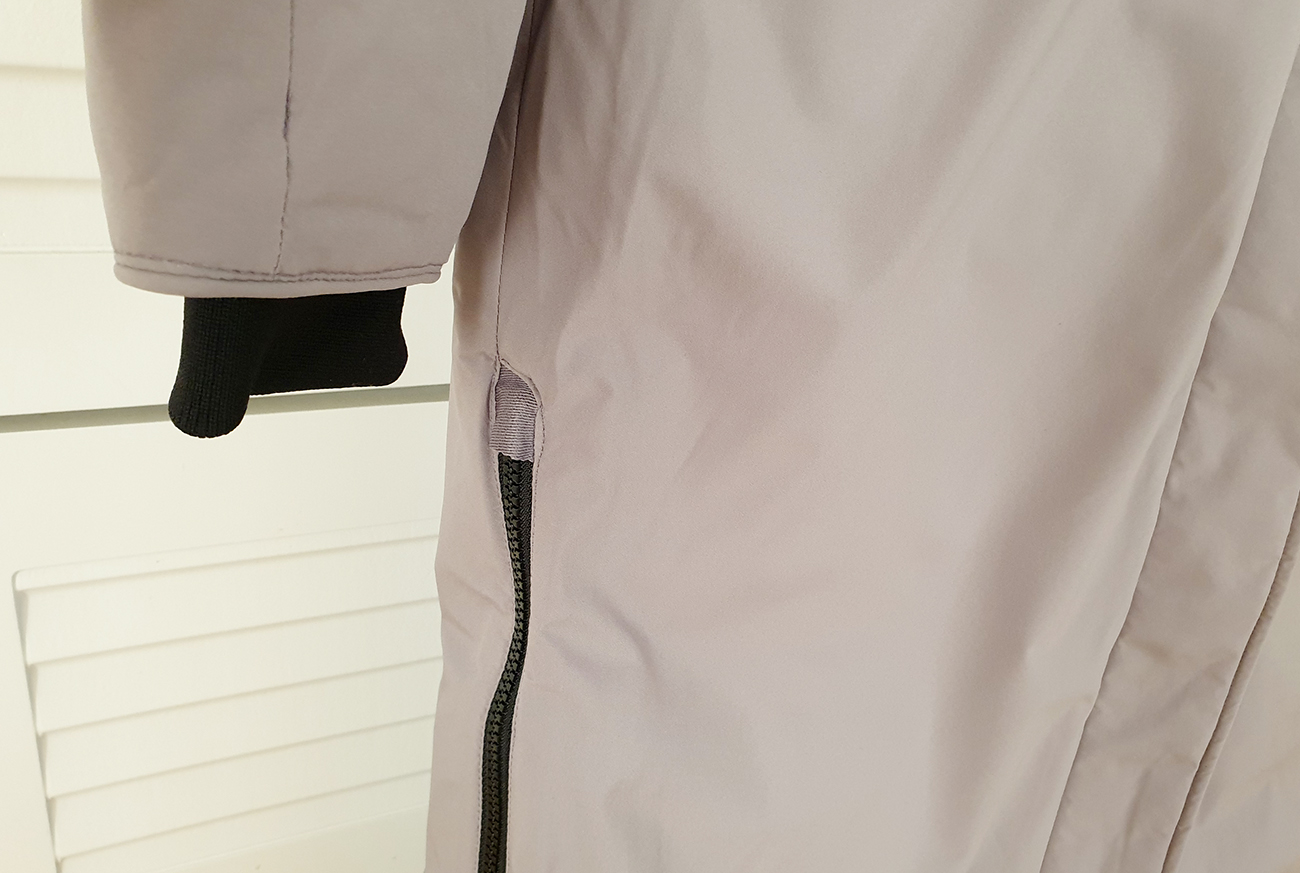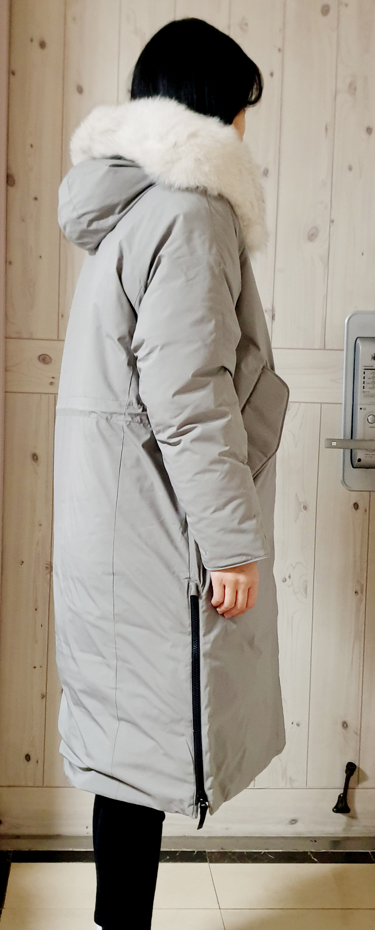 허벅지 쪽의 밑단 부분 양옆으로는 자크가 있습니다. 롱 패딩이다 보니, 산책을 할 때는 불편함이 있을 수 있기에, 자크를 오픈하여 걸음 폭을 조금 더 넓고 활발하게 움직일 수 있도록 편안한 착용이 될 수 있도록 디자인되어 있습니다. 그리고 소매 부분에는 손목을 감싸는 밴딩 처리가 되어 있어서 바람이 슝슝 들어올 일이 없어, 따뜻하게 손목을 감싸도록 되어 있습니다.^^