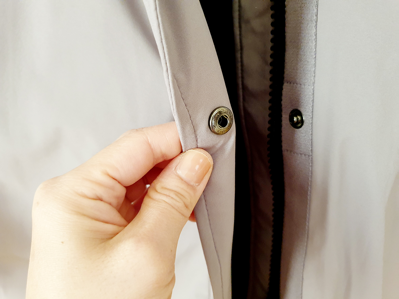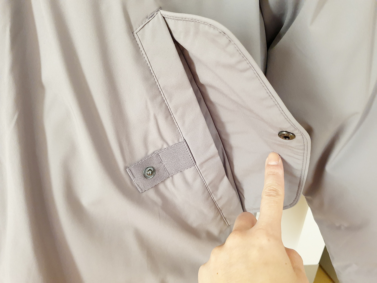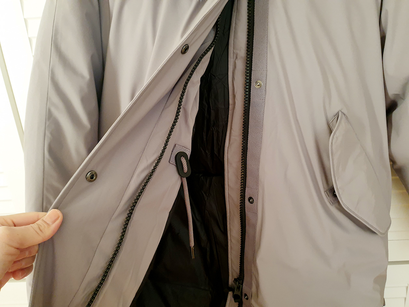 허벅지 쪽의 밑단 부분 양옆으로는 자크가 있습니다. 롱 패딩이다 보니, 산책을 할 때는 불편함이 있을 수 있기에, 자크를 오픈하여 걸음 폭을 조금 더 넓고 활발하게 움직일 수 있도록 편안한 착용이 될 수 있도록 디자인되어 있습니다. 그리고 소매 부분에는 손목을 감싸는 밴딩 처리가 되어 있어서 바람이 슝슝 들어올 일이 없어, 따뜻하게 손목을 감싸도록 되어 있습니다.^^